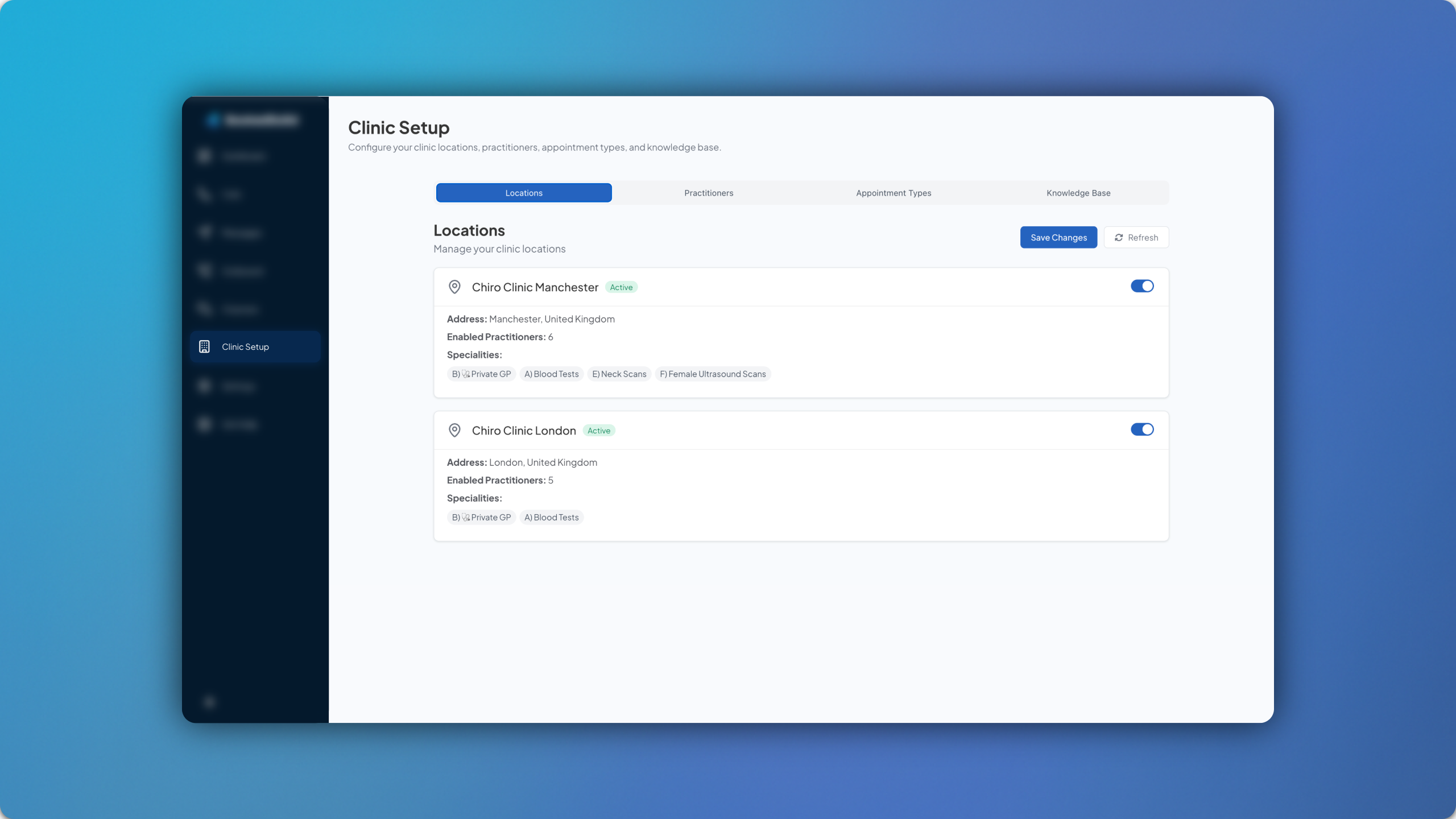 After any edits are made from within your practice management system, you simply have to hit the refresh button from within the Clinic Setup page and they will be updated right away.