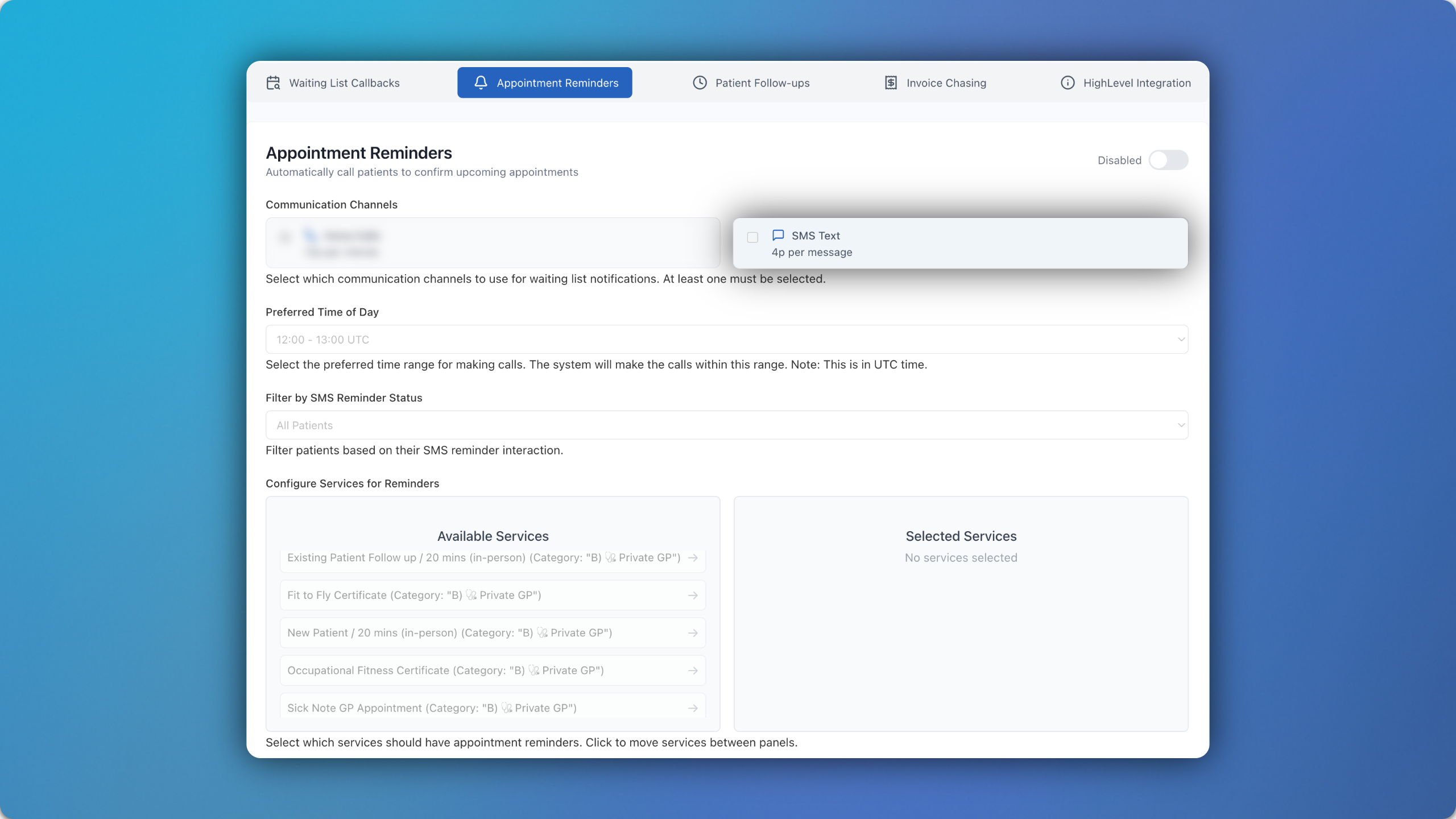 SMS is also included on the other outbound module features: Waiting List Callbacks, Patient Follow-ups, Invoice Chasing and the HighLevel Integration. Each text sent costs just 4 pence in the UK or 8 cents in Australia.